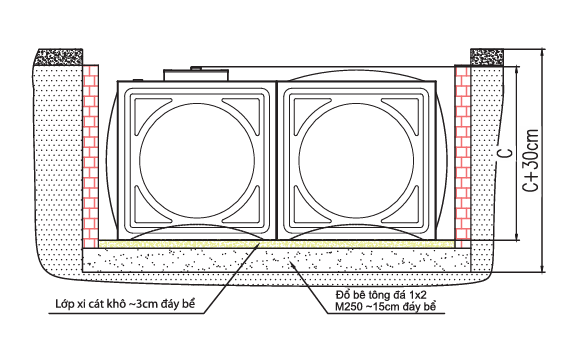 - Chiều cao hố: Chiều cao bể + chiều dày lớp bê tông đáy hố (~15cm) + chiều dày lớp xi cát khô cán đáy hố (~3cm) + chiều dày bê tông nền (~10cm)
